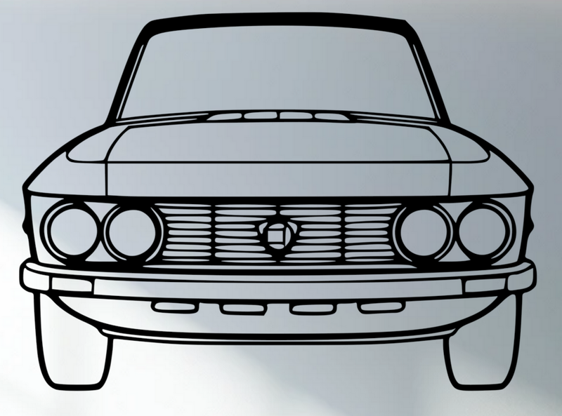 Silhouette da parete Lancia Fulvia vista frontale, realizzata in stampa 3D nei nostri laboratori.
