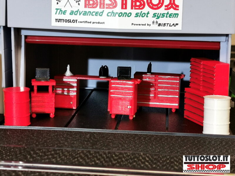 Set accessori per attrezzatura box in scala 1:32, comprendenti: armadio attrezzi con cassetti, carrello grande, carrello piccolo, carrello porta pc, 2 laptop, tavolo da lavoro, latta olio grande, lattina olio piccola ed imbuto. Sono proposti in vari colori che potrai scegliere nel menù a tendina in fondo alla descrizione.