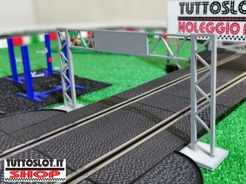 Cartello pubblicitario a ponte per circuito. Con forma a traliccio e con doppio spazio pubblicitario fronte retro. E' fornito con una base che puoi incollare al piano della tua pista. Altezza totale 12,5 cm e larghezza 25. Larghezza interna del ponte 20cm, adatta a tutte le piste, Carrera 1:24 compresa