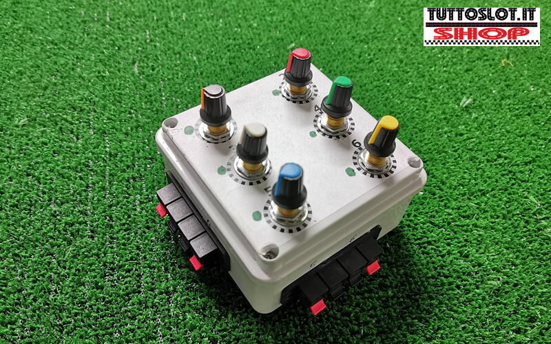 Centralina con 4 o 6 potenziometri per la regolazione indipendente della tensione sulle singole corsie della pista. Agendo sui potenziometri si potrà gestire la tensione delle singole corsie in modo da aumentare o diminuire la tensione. Ottima per equilibrare le prestazioni di macchine diverse o per applicare handicap a piloti più performanti. Control unit with 4 or 6 potentiometers for independent voltage regulation on the individual lanes of the track. By acting on the potentiometers it will be possible to manage the voltage of the single lanes in order to increase or decrease the voltage. Excellent for balancing the performance of different cars or for applying handicaps to more performing drivers.