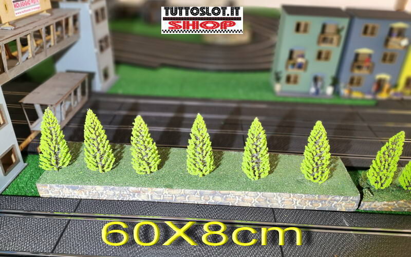 Diorama with trees, produced by Tuttoslot. Diorama base with lawn and wall. Dimensions: 12x8 cm (2 trees) - 20x8 cm (3 trees) - 60x8 cm (7 trees), height 3cm