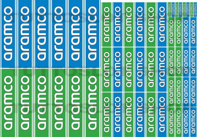 Foglio A4 di vinile adesivo lucido con logo ARAMCO. Ottima adesione su ogni superficie vista la morbidezza del foglio. Visivamente molto bello perchè lucido in superficie. I loghi non sono tagliati. Basterà usare un cutter o forbici per tagliare i loghi ed inserirli nel diorama della vostra pista. I loghi inseriti sono in diverse misure, per meglio adattarli alle varie superfici della tua pista e auto. Se non trovi il logo che desideri o se vuoi stampare il tuo logo, contattaci.