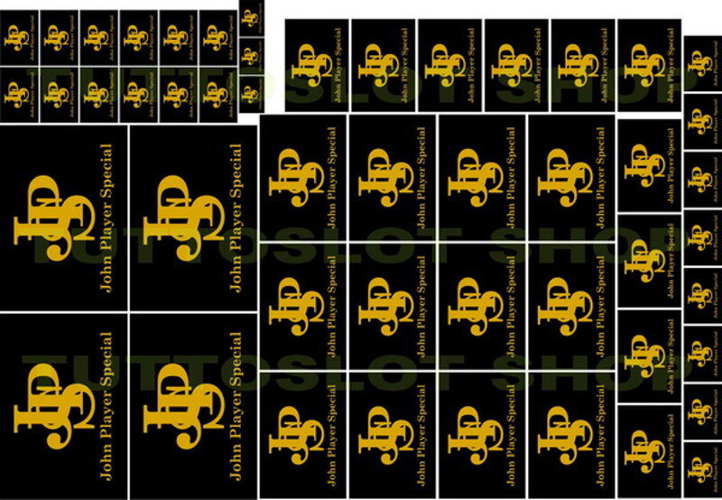 A4 sheet of glossy adhesive vinyl with JOHN PLAYER SPECIAL logo. Excellent adhesion on any surface due to the softness of the sheet. Visually very nice because it is shiny on the surface. Logos are uncut. Simply use a cutter or scissors to cut out the logos and insert them into your track diorama. The logos included are in different sizes, to better adapt them to the various surfaces of your track and car. If you can't find the logo you want or if you want to print your logo, please contact us.