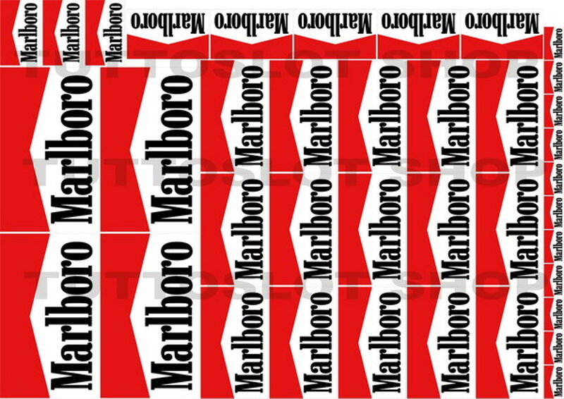 Foglio A4 di vinile adesivo lucido con logo MARLBORO. Ottima adesione su ogni superficie vista la morbidezza del foglio. Visivamente molto bello perchè lucido in superficie. I loghi non sono tagliati. Basterà usare un cutter o forbici per tagliare i loghi ed inserirli nel diorama della vostra pista. I loghi inseriti sono in diverse misure, per meglio adattarli alle varie superfici della tua pista e auto. Se non trovi il logo che desideri o se vuoi stampare il tuo logo, contattaci.