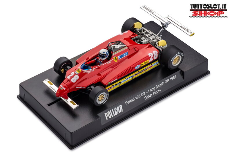 Policar Ferrari 126 C2 no. 28 driven by Didier Pironi at the 1982 Long Beach GP. A perfect reproduction of the iconic car and winner of the constructors' world championship, but also the car that stood out for the end of Didier Pironi's career due to an accident and for the fatal accident that cost the life of Gilles Villeneuve. The car made by Policar (CAR09a) stands out for the almost obsessive attention to detail and the reproduction of individual parts. An excellent car also for a static exhibition.