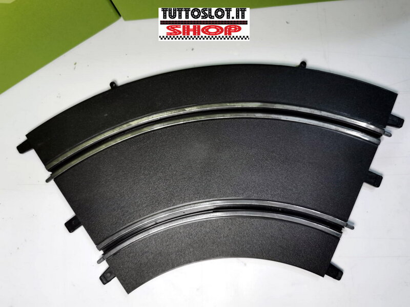 Polistil 60° standard curve Code A9. New or finely restored piece. Perfectly working and guaranteed in its functionality. Excellent for lengthening and/or modifying your Polistil track. It should be noted that the pieces were produced between the 70s and 90s and there are no pieces produced more recently. Therefore, even the new piece may have a slightly dark metal part in some parts.