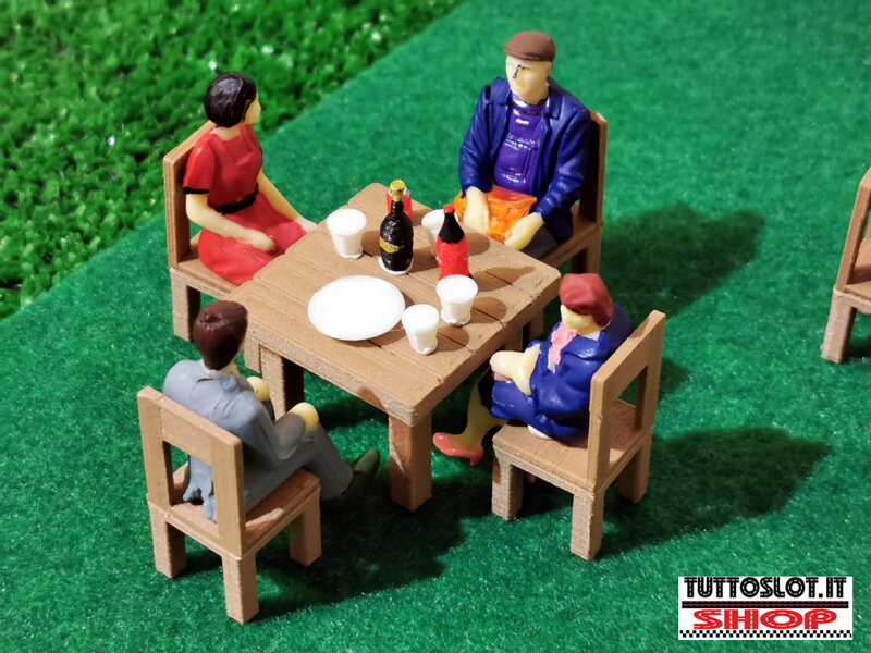 Set tavolo quadrato con 4 sedie. Tutto stampato in plastica con colore e fibre di legno, per rendere perfetto l'effetto legno dei prodotti. Perfetto per migliorare il tuo diorama. Misure del tavolo mm 32x32x25h.