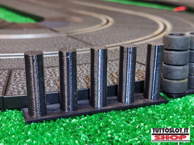 Molded plastic support for slot rubbers to be used as a barrier. Simple and light, yet strong. To turn your old tires into a nice tire barrier for your circuit. The set includes 5 supports. Two holes were created inside to be able to fix the barriers to the floor of the runway. The set does not include the tires. You can buy it complete with tires by selecting it from the drop-down menu at the bottom of the description.